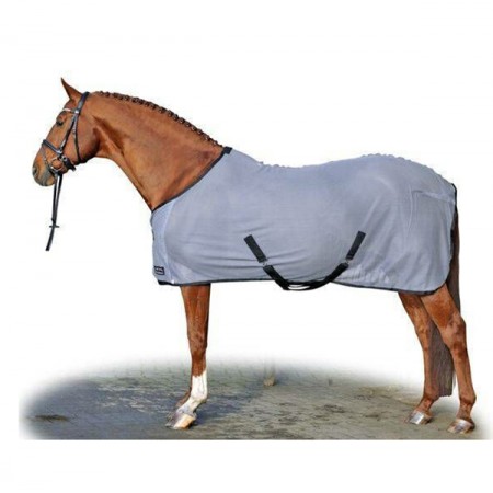 Легкая сетчатая попона из мягкой светлой серой ткани с хорошей посадкой, с удобными троками, шаговой складкой, двойными регулируемыми застежками на груди, съемным ремешком на хвосте и защитой хвоста. Попона отлично защищает от надоедливых насекомых во время уличных прогулок. Выполнена из прочного материала, устойчивого к разрыву и имеющего защиту от проколов (укусов,) приятного для кожи материала с контрастным кантом.